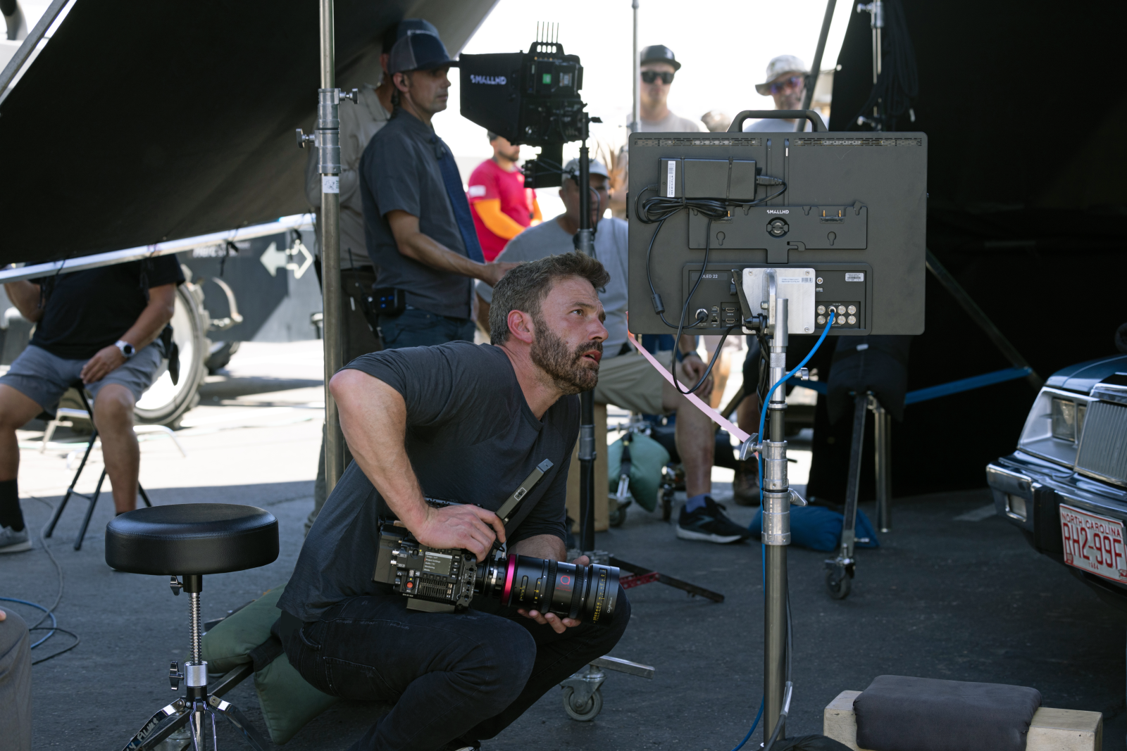Ben Affleck with RED V-RAPTOR 8K VV and Angénieux Optimo Ultra Compact 28-76 zoom, viewing on SmallHD OLED 22 monitor. Photo by Ana Carballosa.