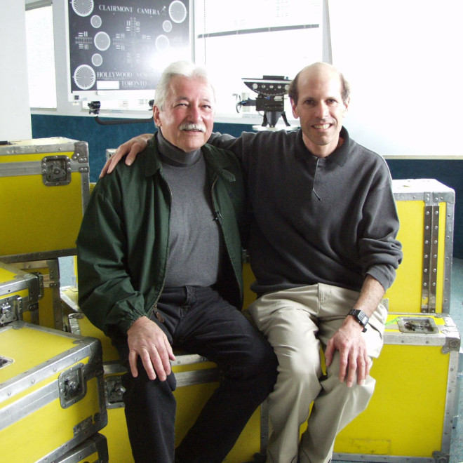 Photo : Denny Clairmont and Jon Fauer ASC sitting on the distinctive yellow cases at Clairmont Camera in 2003. Courtesy of Jon Fauer.
